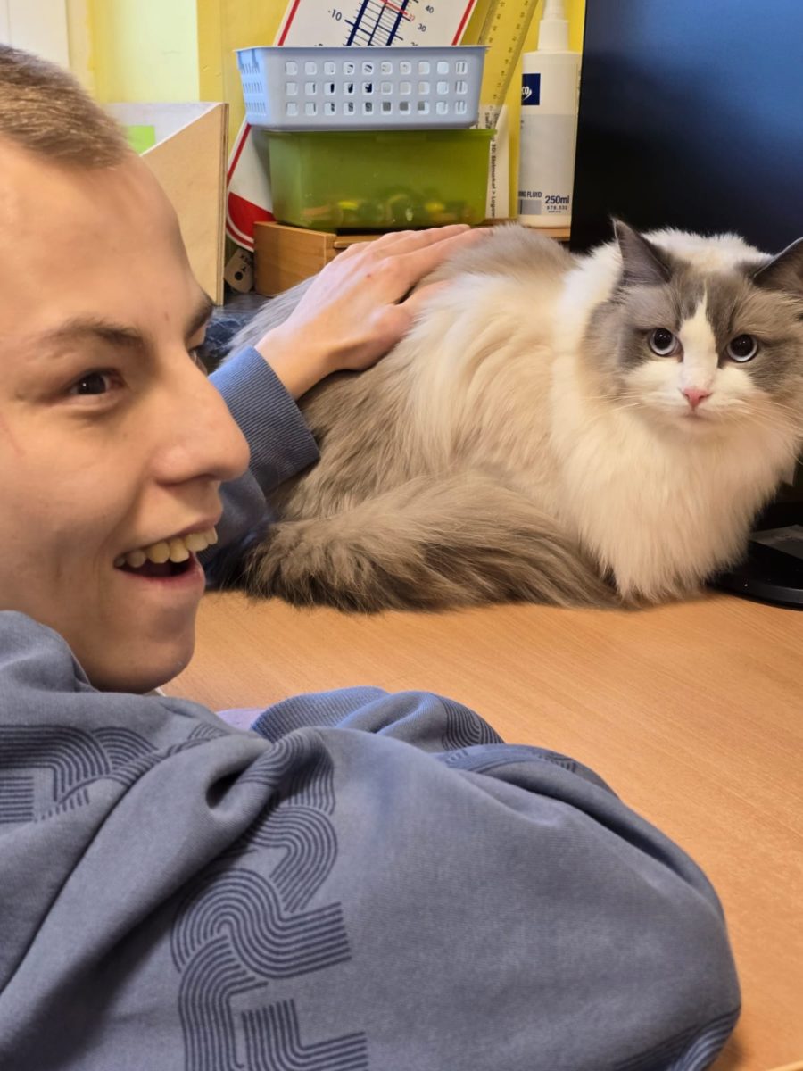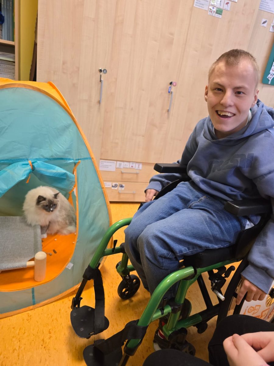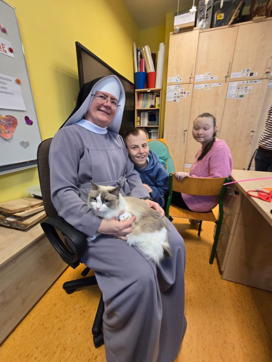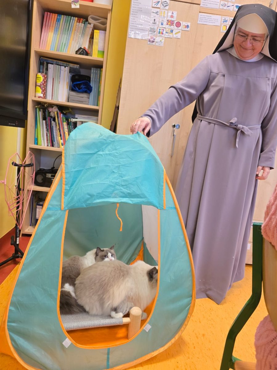 W naszej szkole koty towarzyszą nam podczas zajęć, wprowadzając spokojną i przyjazną atmosferę. Podczas zajęć w Szkole Przysposabiającej do Pracy uczniowie mają okazję spędzać czas z naszymi kocimi towarzyszami, głaskać je oraz obserwować ich zachowanie.