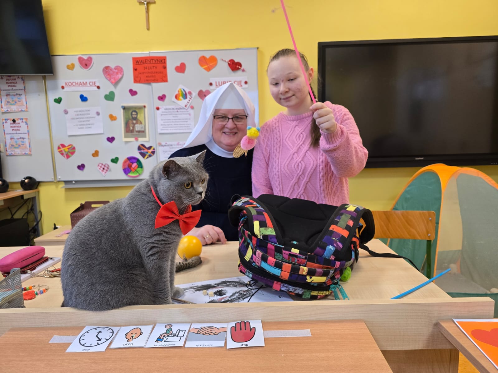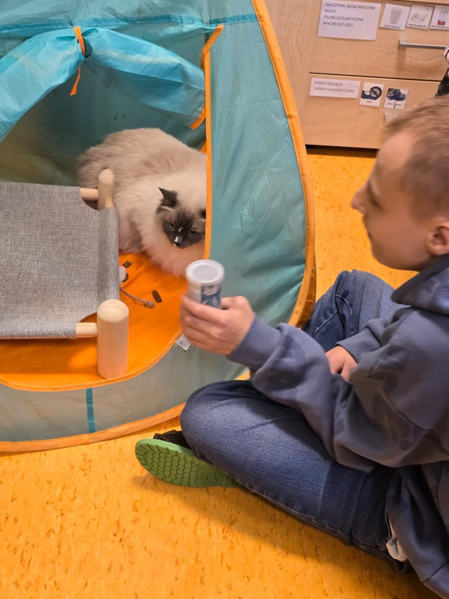 Kontakt ze zwierzętami sprzyja wyciszeniu, pomaga w koncentracji oraz buduje poczucie bezpieczeństwa. Koty chętnie towarzyszą uczniom podczas różnych aktywności, stając się ważną częścią szkolnej codzienności.